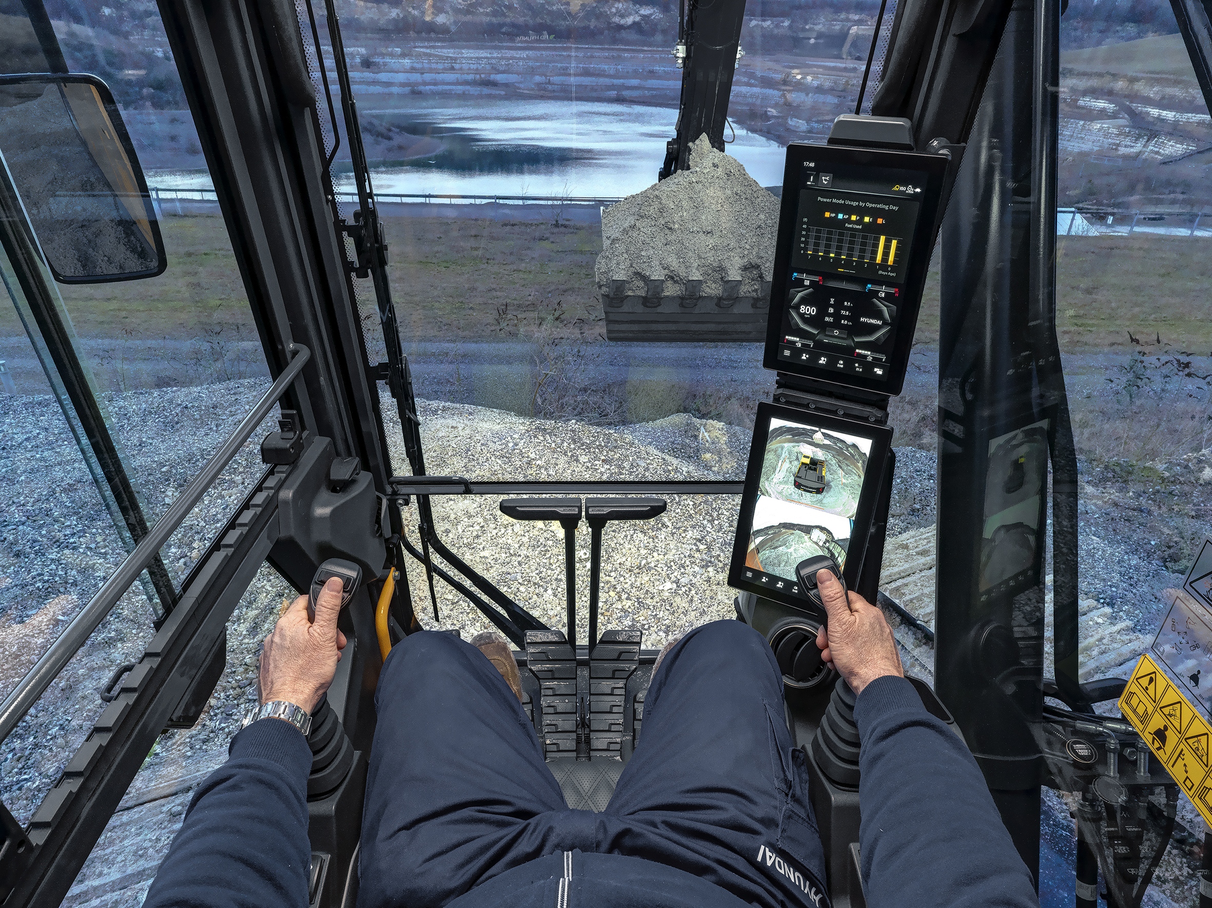 Biztonsági szempontból szintén nem fukarkodtak: a Lift Assist és az Advanced Lift Assist vizuális biztonsági zónákat jelöl ki, az E-Boundary funkcióval plafon-, padló- és falhatárokat lehet beállítani, a frissített Smart Around View Monitor (SAVM) rendszer már hat kamerával dolgozik és AI-alapú személyfelismerést alkalmaz, a radaros objektumdetektálás pedig hang- és képi figyelmeztetést ad — automatikus leállítással, ha az operátor nem reagál.