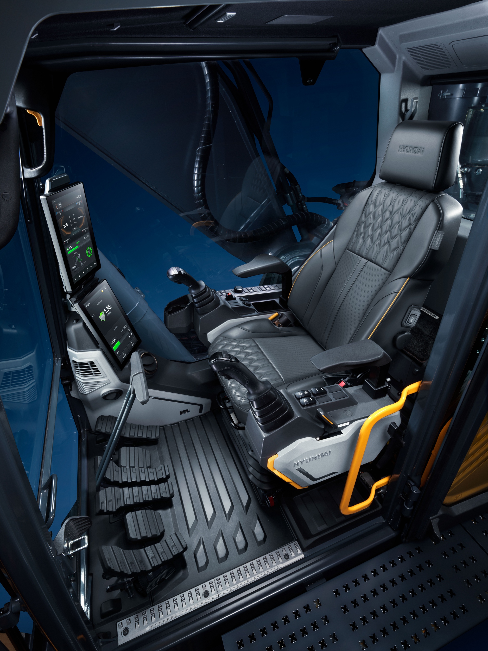 A fülkében egy vagy két 12,8 colos full HD érintőképernyő fogadja az operátort, digitális kulcs opcióval (akár hat kolléga és sofőr között megosztható), prémium üléssel és 68 dB(A)-s belső zajszinttel ami ebben a kategóriában az egyik leghalkabb kabin. A gép 11 százalékkal hosszabb futóművet kapott (4040 mm) és 6 százalékkal nehezebb ellensúlyt, ami szektorkiemelkedő emelési kapacitást eredményez mind elöl, mind oldalra. A standard monogém 6245 mm, a kanállár 3100 mm, a kar szakítóerő 141 kN, a kanál szakítóerő 206 kN.