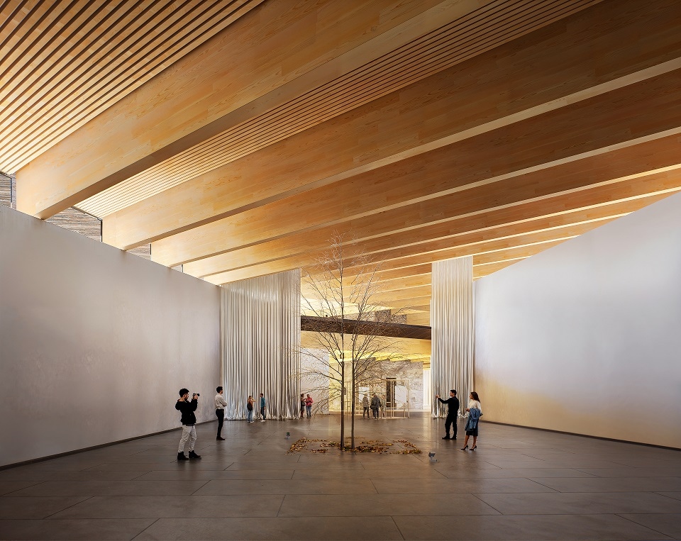 A koncepció egyik kulcseleme a „bevágott” terek rendszere: belső kertek, udvarok és fényudvarok tagolják az épületet, amelyek egyszerre biztosítanak természetes megvilágítást és vizuális kapcsolatot a környezettel. Ez a fajta térszervezés a múzeumi funkciót is újraértelmezi: a kiállítás nem zárt dobozok sorozata, hanem a természeti kontextusba ágyazott élmény.