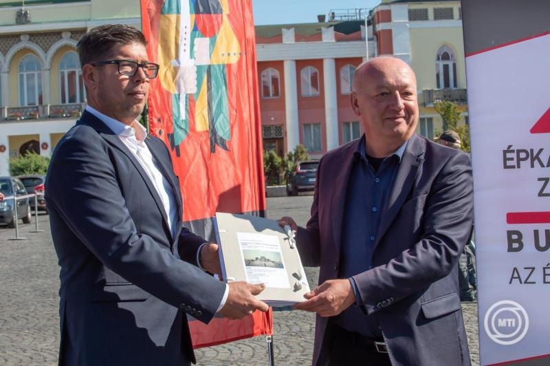 Pávkovics Gábor Mohács polgármestere (j) átadja a tervdokumentációt Monori Csabának, a kivitelező Épkar Zrt. képviselőjének (b) a Széchenyi tér munkaterületének hivatalos átadásán Mohácson 2025. október 2-án.