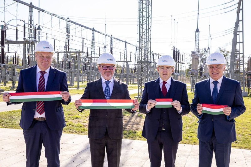 Az új alállomás ünnepélyes átadásán 2025. október 17-én jelen volt (b-j) Torda Balázs, az OPUS TITÁSZ Zrt. elnök-vezérigazgatója, Lantos Csaba energiaügyi miniszter, Mészáros Lőrinc, a Mészáros Csoport tulajdonosa és Dr. Kovács Ferenc Nyíregyháza polgármestere.